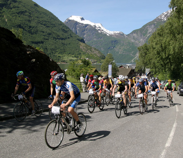 Her ser vi teten til venstre og dei øvrige halsane like bak rett etter start.