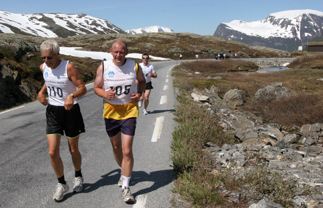 Syklistar og løparar på rekke og rad. Frå venstre Gunnar Sævik som var med for 3.gong, Arve Drabløs som har sprunge kvart løp sidan 2000 og Christian Stokkevåg som spring sitt 7. Geiranger Halvmaraton.![]() Foto: Knut Arild Maråk |