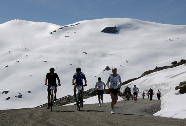 Her er vi rett før siste drikkestasjon, nesten 2 km frå mål. Skispora i bakgrunnen kjem ned frå Blåtind. Løpar med startnummer nr 23 er Per Arild Bolaas og nr 21 er Hallstein Saunes.![]() Foto: Knut Arild Maråk |
